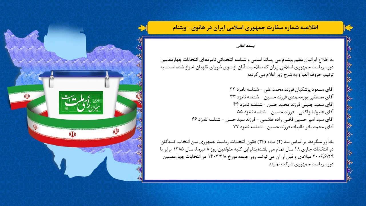اطلاعیه شماره 7 برگزاری چهاردهمین دوره انتخابات ریاست جمهوری اسلامی ایران در هانوی