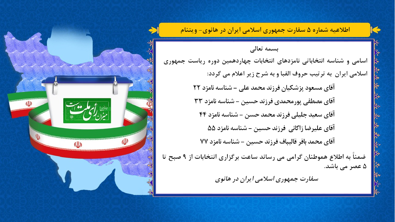 اطلاعیه شماره 5 برگزاری چهاردهمین دوره انتخابات ریاست جمهوری اسلامی ایران در هانوی